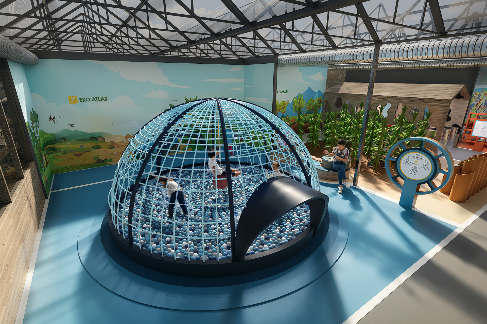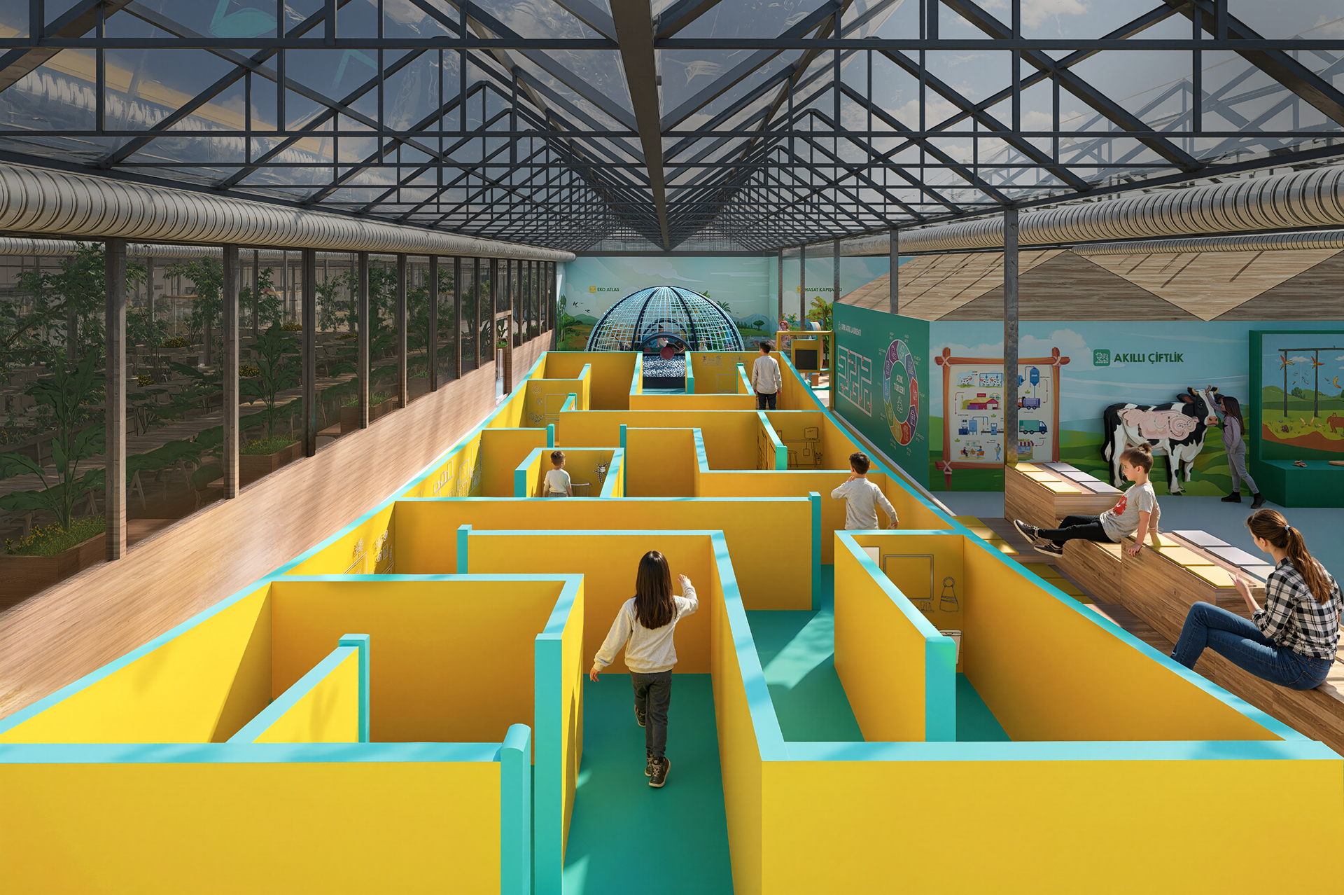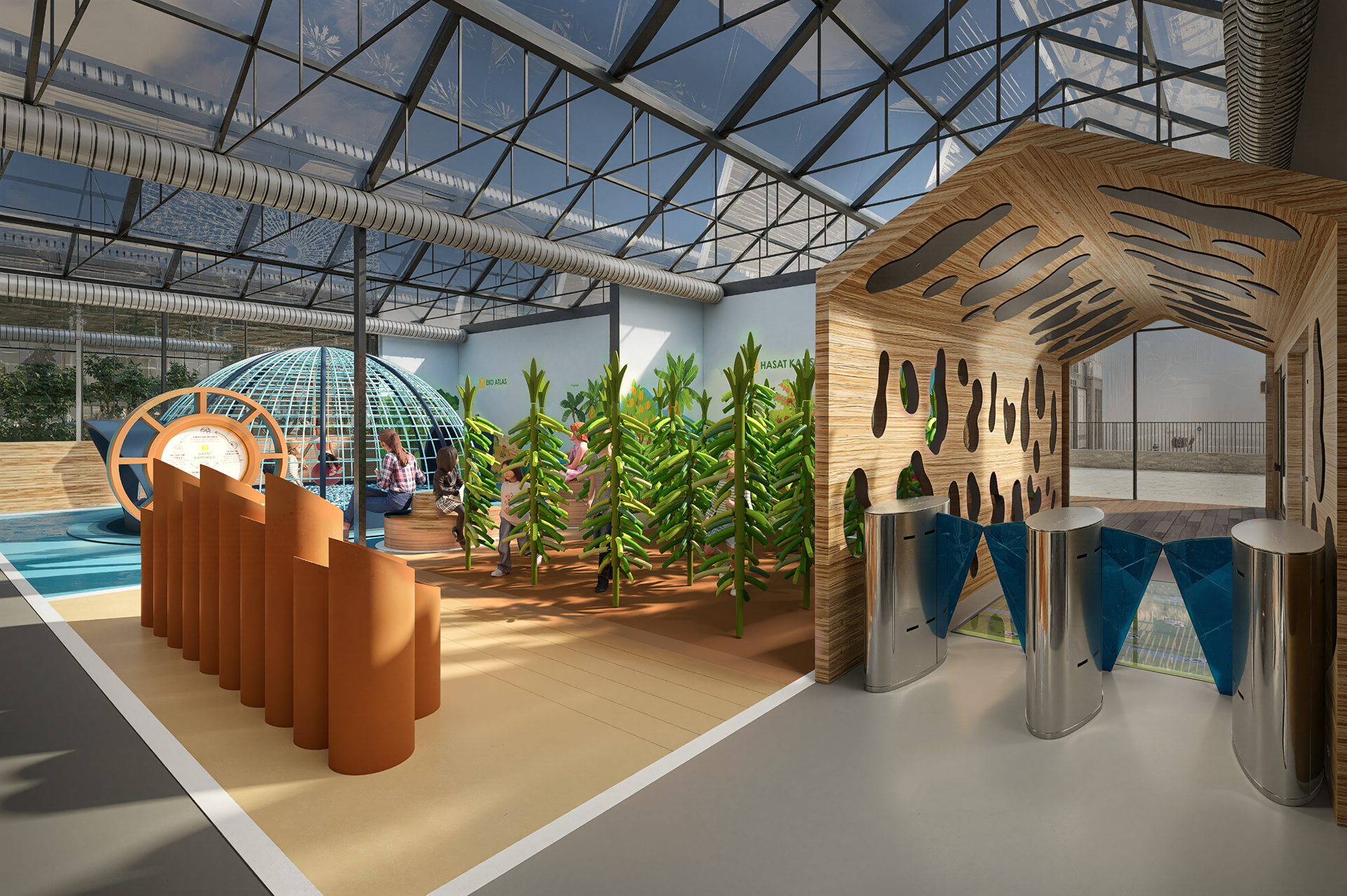 Mimari tasarım sürecinde, farklı temalara sahip alanlar; Dünya'dan Toprağa, Sıfır Atık, Tropik Ada ve Akıllı Çiftlik başlıkları altında organize edilmiştir. Bu alanlar, atölye alanı ile birlikte ana giriş, mağaza ve restoran fonksiyonlarıyla bütünleşecek şekilde planlanmış; mekânsal süreklilik ve kullanım senaryoları doğrultusunda tek bir mimari sistem içinde ele alınmıştır. Proje; farklı yaş gruplarına ve kullanım senaryolarına hitap eden tematik alanların, dolaşım, ölçek, malzeme ve mekânsal süreklilik kriterleri doğrultusunda bir araya getirilmesi üzerine kuruludur.
